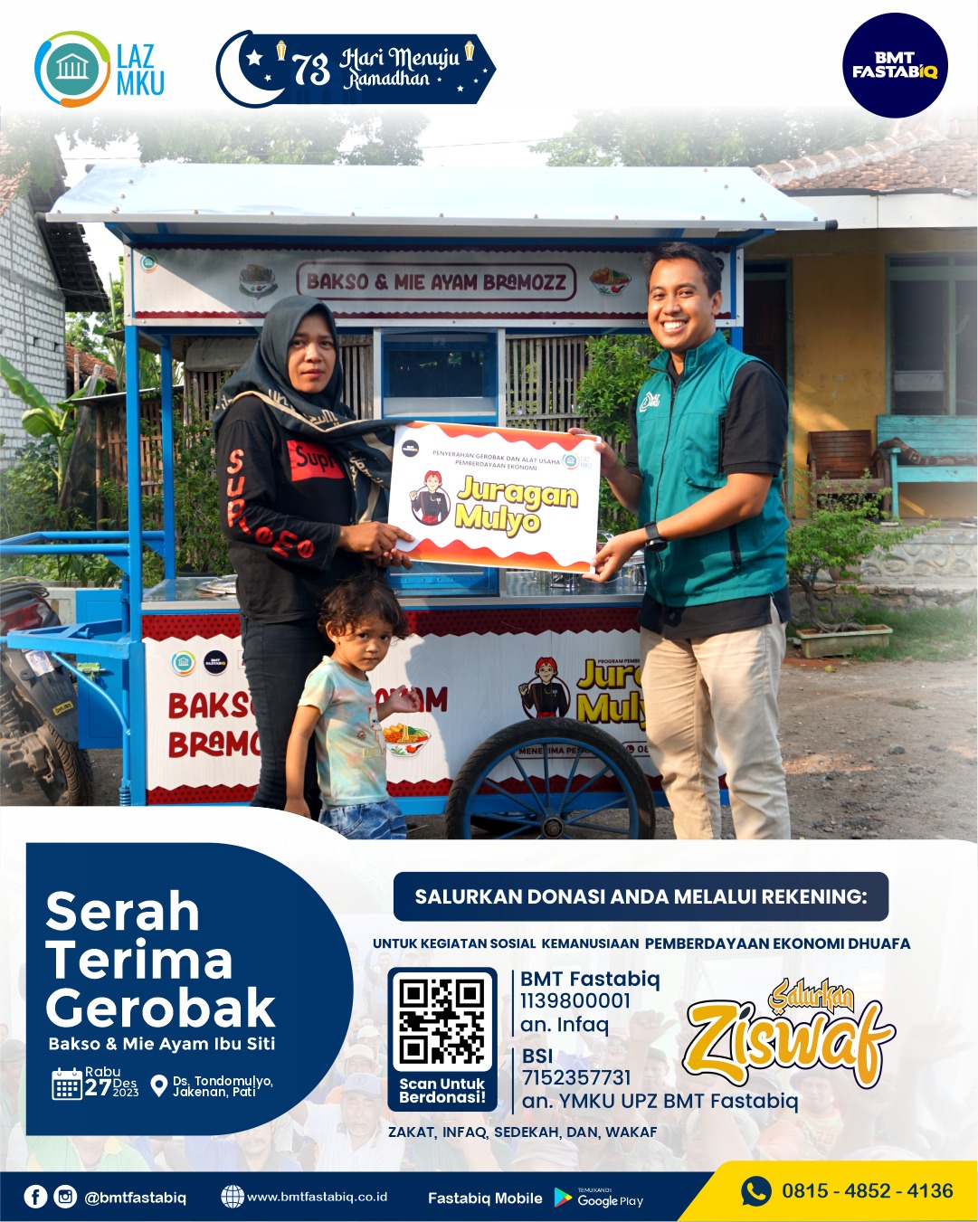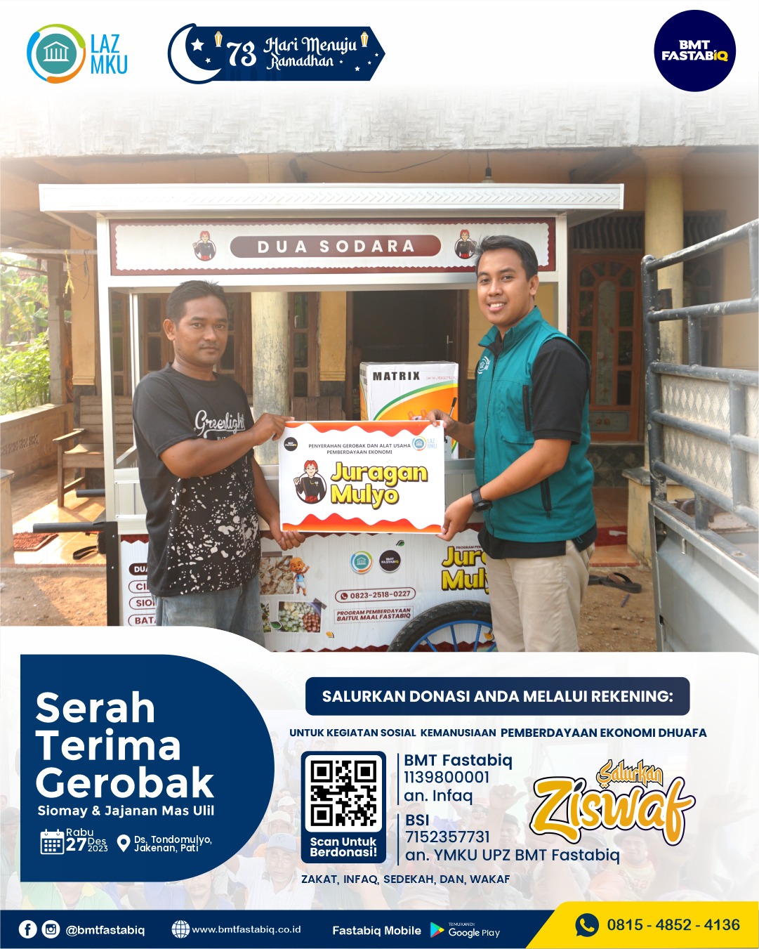 Pati, 27 Desember 2023 – Program Juragan Mulyo dari ULAZ MKU Fastabiq menyerahkan dua unit gerobak usaha kepada dua penerima manfaat di Desa Tondomulyo, Kecamatan Jakenan, Kabupaten Pati, Jawa Tengah. Peristiwa ini membawa kebahagiaan tersendiri bagi Mas Ulil dan Ibu Siti, sebagai penerima manfaat.