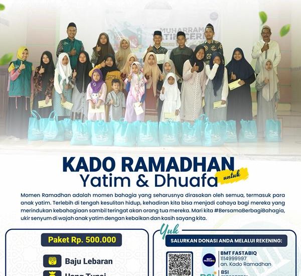 Yuk, ikut berpartisipasi dalam program sedekah paket Kado Ramadhan ini! Dengan Rp. 500.000/paket, kita bisa memberikan mereka baju Lebaran dan uang tunai, serta menyalurkan kebahagiaan dalam momen yang spesial ini.