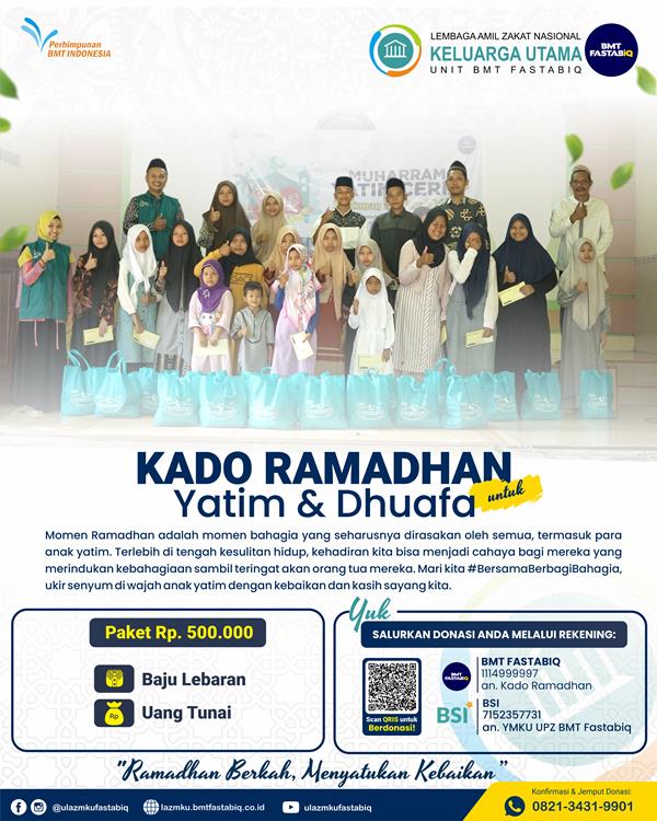 Bersama ULAZ MKU Fastabiq, mari kita salurkan kebaikan dan kasih sayang kita kepada mereka dengan #KadoRamadhan. Setiap kebaikan yang kita lakukan bisa menjadi cahaya kebahagian bagi mereka.