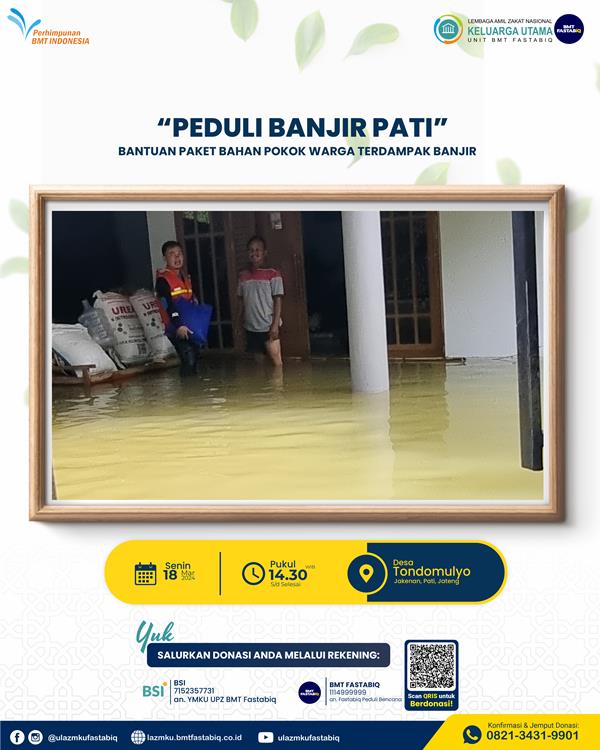 🌊🤝 ULAZ MKU Fastabiq hadir untuk peduli kepada saudara-saudara kita yang terdampak banjir di Kabupaten Pati! Tahap pertama dari program bantuan ini disalurkan kepada warga di Desa Widorokandang Kecamatan Pati, Desa Tondomulyo Kecamatan Jakenan dan Desa Sunggingwarno Kecamatan Gabus.