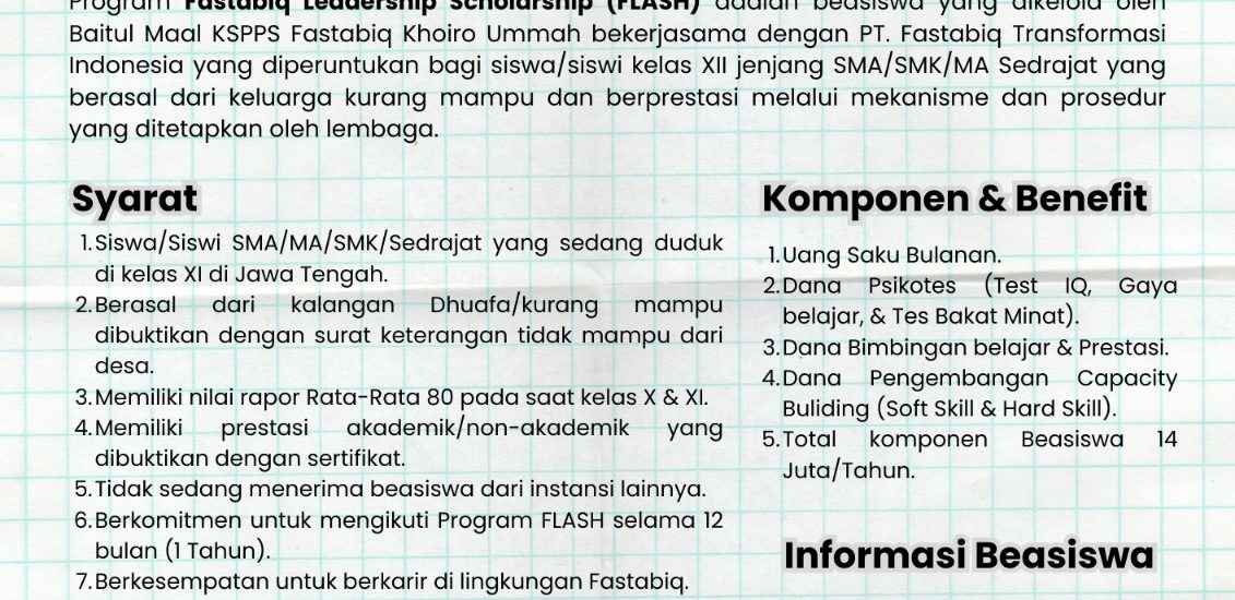 Program Fastabiq Leadership Scholarship (FLASH) adalah beasiswa yang dikelola oleh Baitul Maal KSPPS Fastabiq Khoiro Ummah bekerjasama dengan PT. Fastabiq Transformasi Indonesia yang diperuntukan bagi siswa /siswi SMA/SMK/MA Sederajat Kelas XII di Jawa Tengah dan berasal dari keluarga kurang mampu.
